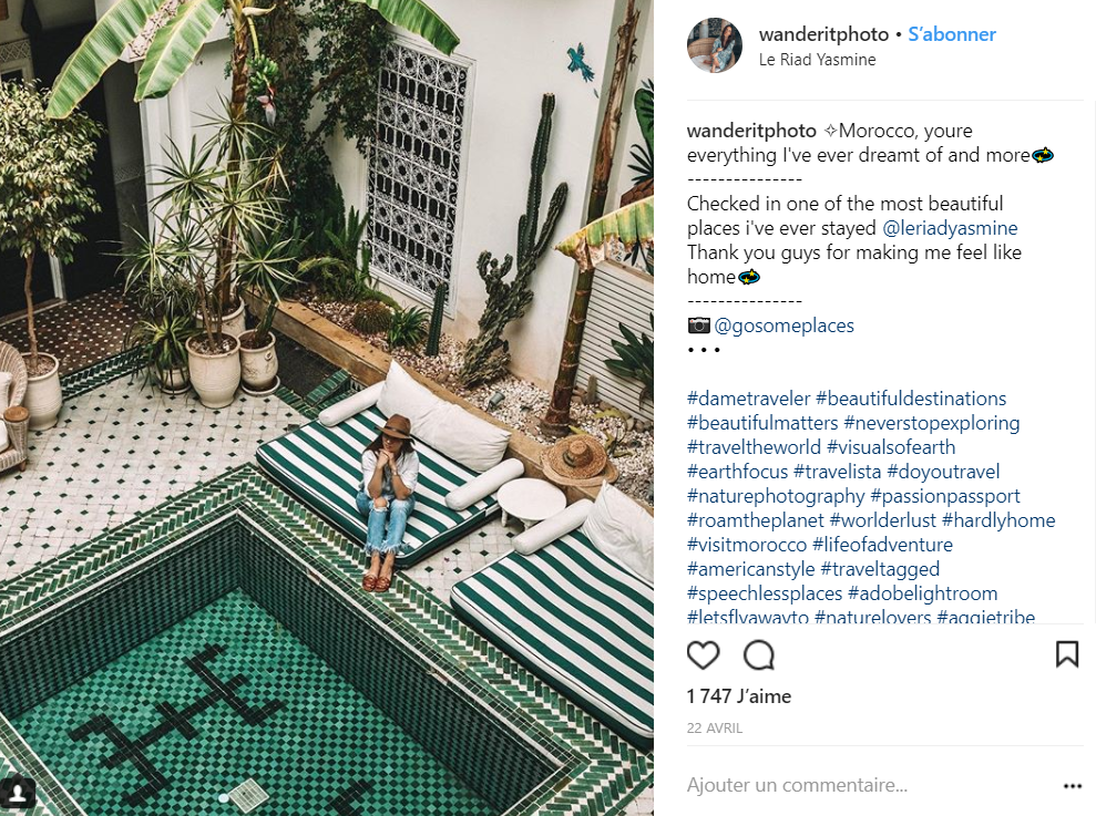 Le Riad Yasmine est une boutique/hôtel privé de 8 chambres situé au cœur de la Médina de Marrakech. Ce lieu est devenu connu et très fréquenté grâce à une photo posté sur Instagram. Depuis les clients défilent et les photos dans le traditionnel patio se multiplient.