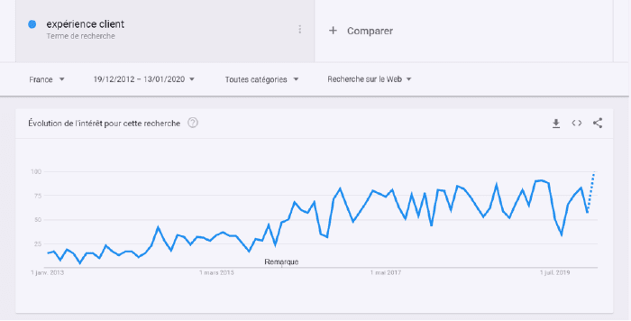 On peut voir dans le graphique ci-dessous la popularité croissante de la notion d’expérience client depuis les années 2012-2013. Plus que l’effet d’une mode, cette évolution est le signe d’une prise de conscience (Source : Google Trends).